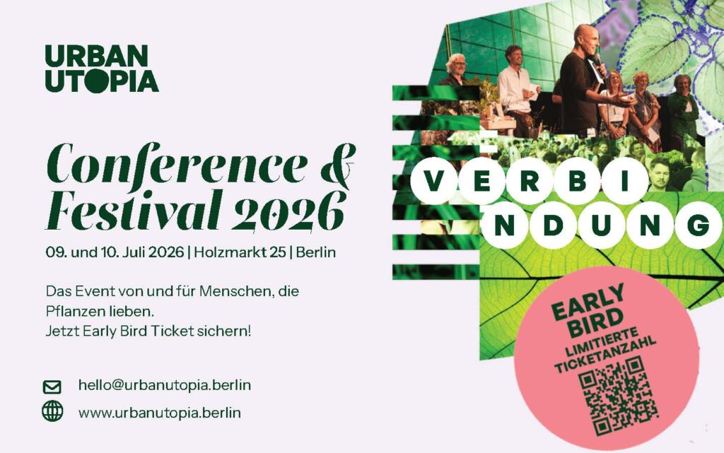Das wahrscheinlich spektakulärste Pflanzenevent des Jahres geht diesen Juli zum zweiten Mal an den Start! Die URBAN UTOPIA Conference begrüßt dich am 09. und 10. Juli im legendären Holzmarkt 25 in Berlin – eine interdisziplinäre Fachveranstaltung von und für Menschen, die Pflanzen lieben. Hier versammeln sich erneut inspirierende Persönlichkeiten aus verschiedenen Bereichen der Pflanzenbranche im DACH Raum: Expert:innen, Talente und kreative Köpfe, die über die Zukunft der Pflanzen- und Begrünungswirtschaft diskutieren. Aufbauend auf der erfolgreichen ersten Konferenz entsteht ein vielfältiges Programm aus Best Practices, Panels und Workshops. Passend zum diesjährigen Motto “Verbindung” liegt ein starker Fokus auf Networking, um Transfer von Wissen, Synergien und Kooperationen zu fördern – von Landschaftsarchitektur und Stadtentwicklung über Innovation und Wissenschaft bis hin zu Kunst, Kultur und Umweltbildung.