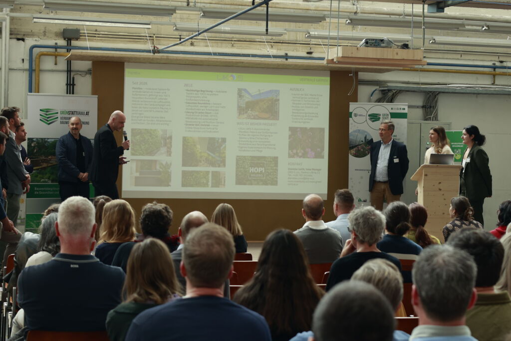 Besonders inspirierend war der Programmpunkt „Erfolg“, bei dem realisierte Projekte unserer Partner:innen präsentiert wurden: Von partizipativen Unternehmensgärten über innovative Dach- und Fassadenbegrünungen bis hin zu großflächigen Überdachungslösungen und einer neue Produktionsanlage für Pflanzenkohle wurde deutlich, wie vielfältig die Bauwerksbegrünungsbranche ist. Die vorgestellten Projekte zeigten eindrucksvoll, wie aus Planung konkrete, wirksame Umsetzung wird.