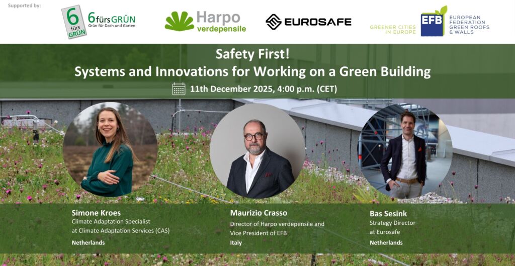 Participants can look forward to two exciting presentations: the EU project PIISA, which will introduce itself and share insights on Incentivising Green Roof Adoption through Insurance, and Harpo Verdenspile, which will present how the company internally approaches safety on green roofs, offering a look into their safety systems and innovations.
